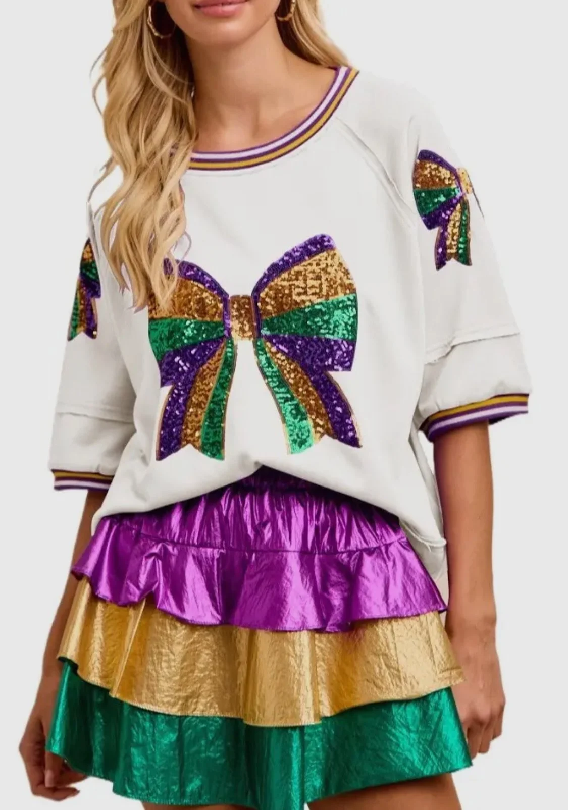 Image 1 of 2 Image 2 of 2 Mardi Gras themed sequin bow top $46.00 Size: Select Size S M L XL S Color: Select Color White Purple Quantity: Add To Cart Added!